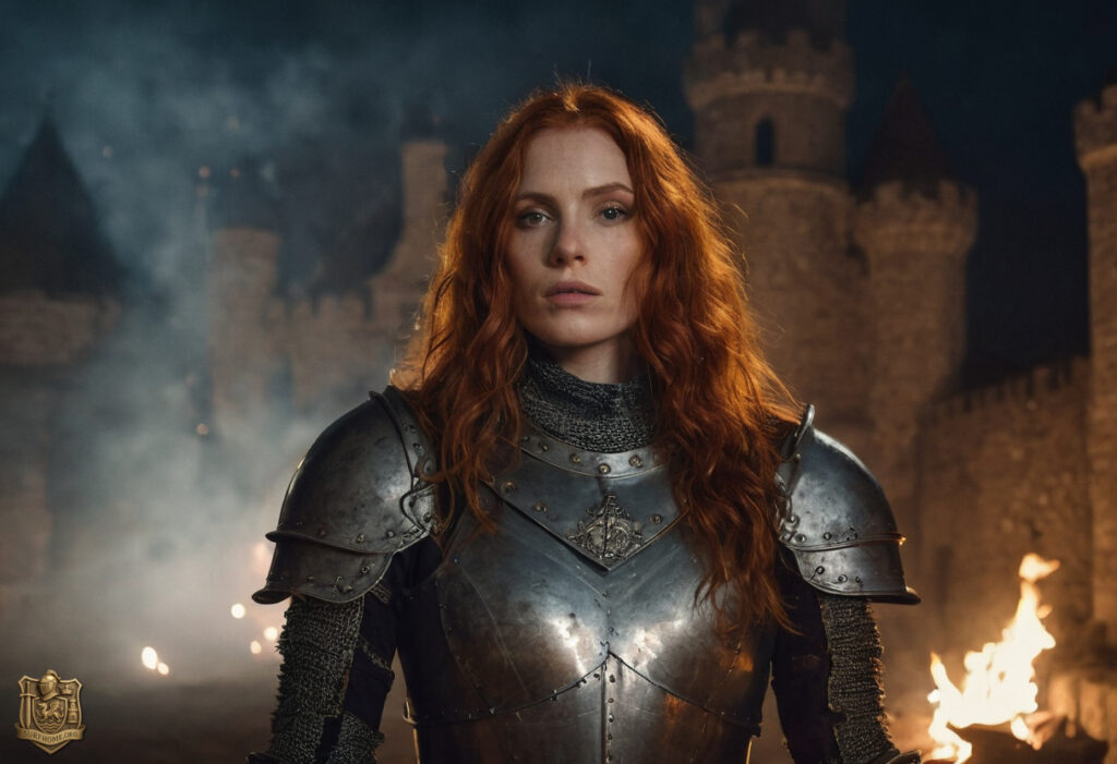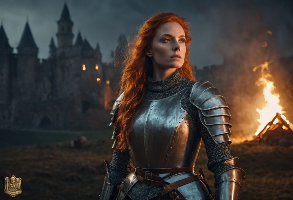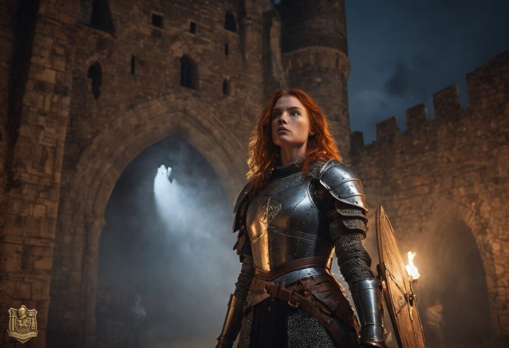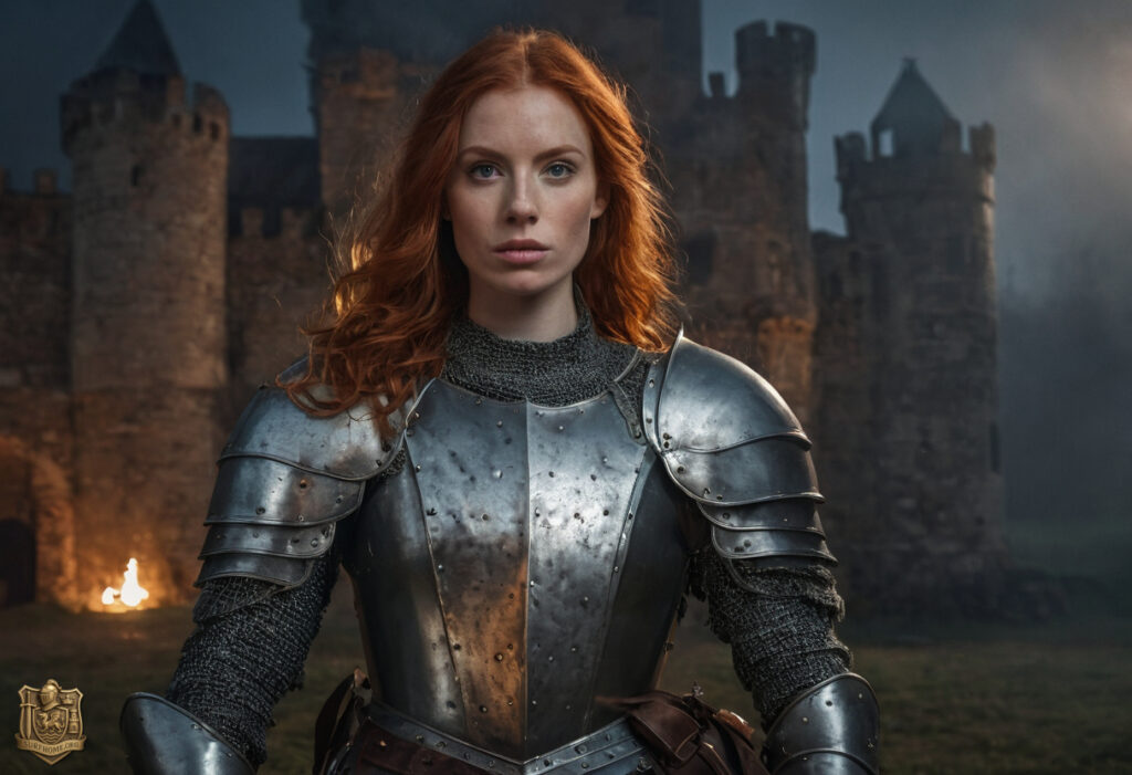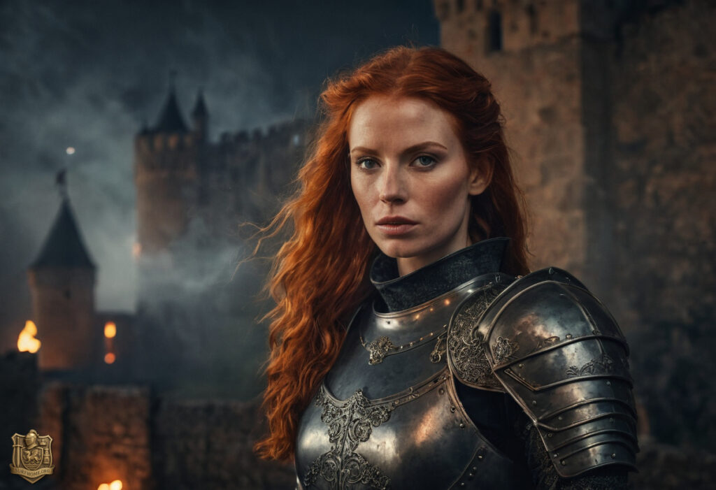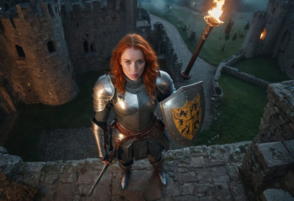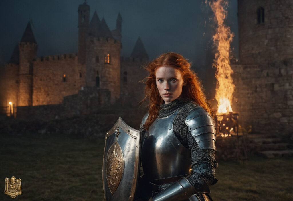 In dieser Bilderserie entfaltet sich eine mystische Szenerie: Eine junge, wunderschöne Frau mit feuerrotem Haar, gekleidet in glänzende Ritterrüstung, erhebt Schild und Schwert im Schein flackernder Fackeln. Im Hintergrund thront eine alte Burg, geheimnisvoll erleuchtet, umhüllt von sanftem Nebel.