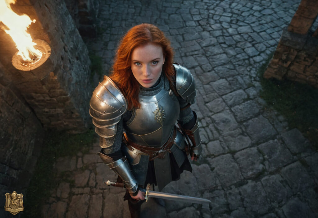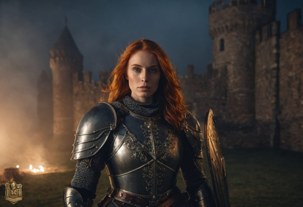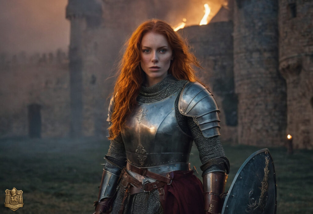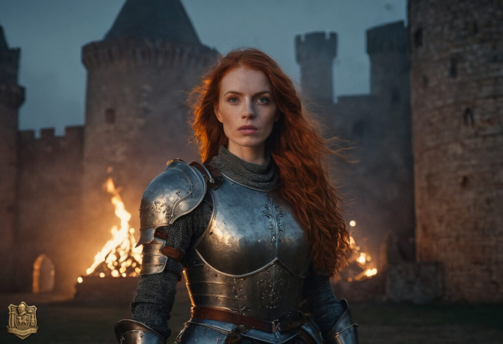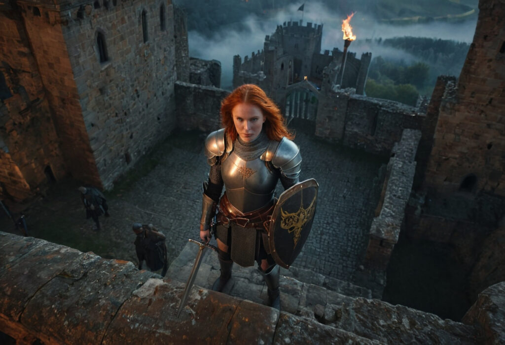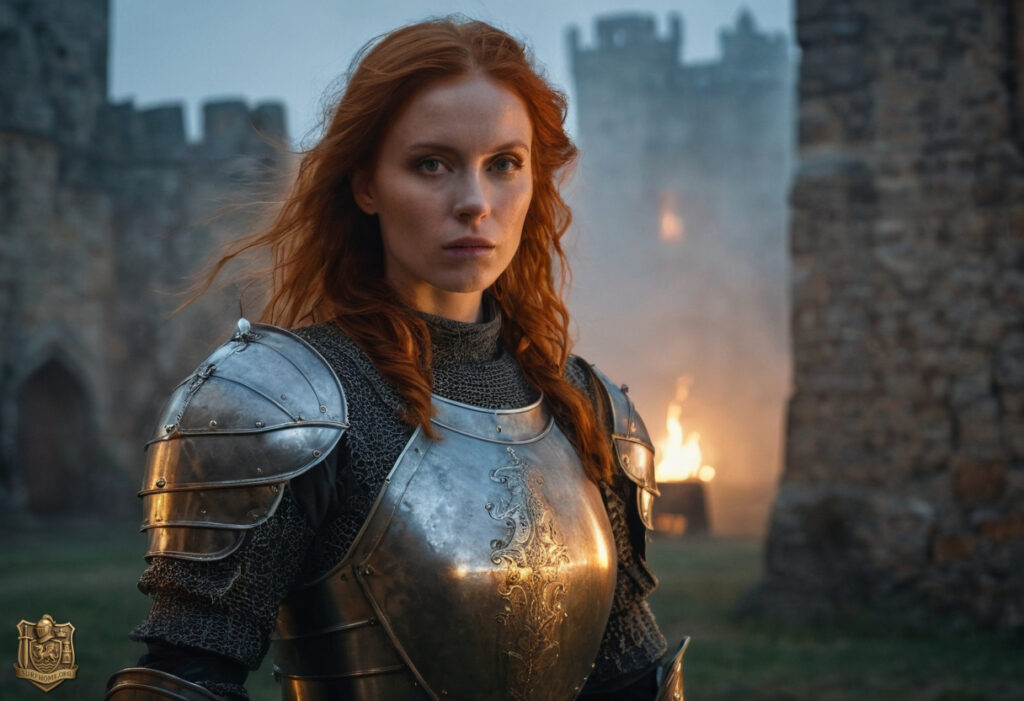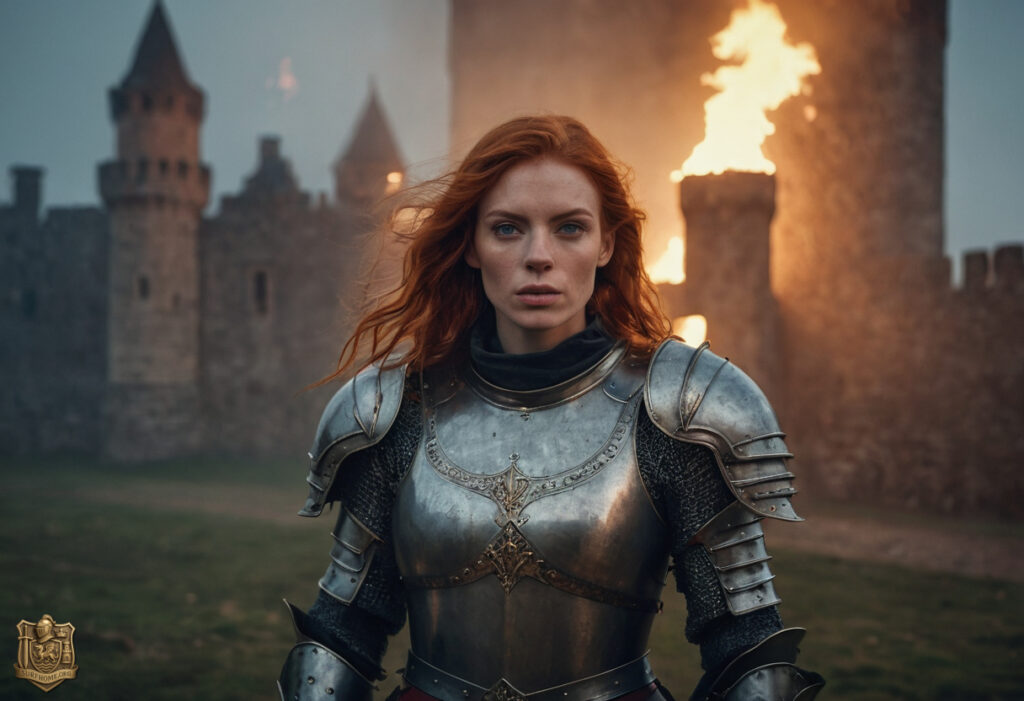 In dieser Bilderserie entfaltet sich eine mystische Szenerie: Eine junge, wunderschöne Frau mit feuerrotem Haar, gekleidet in glänzende Ritterrüstung, erhebt Schild und Schwert im Schein flackernder Fackeln. Im Hintergrund thront eine alte Burg, geheimnisvoll erleuchtet, umhüllt von sanftem Nebel.