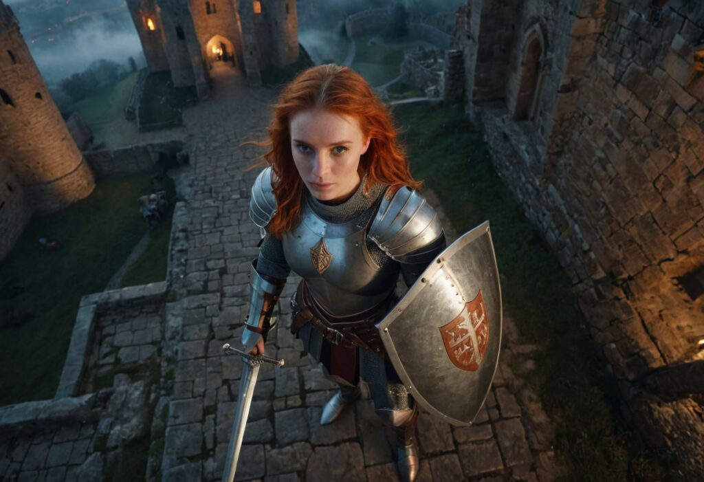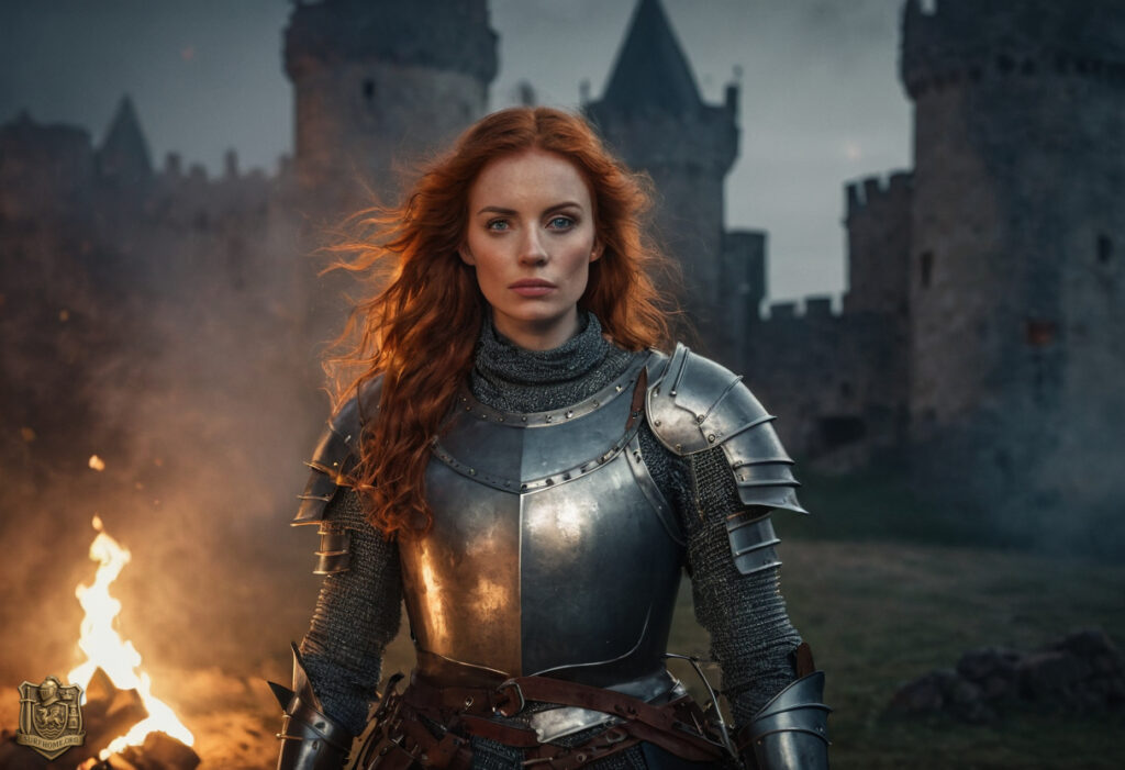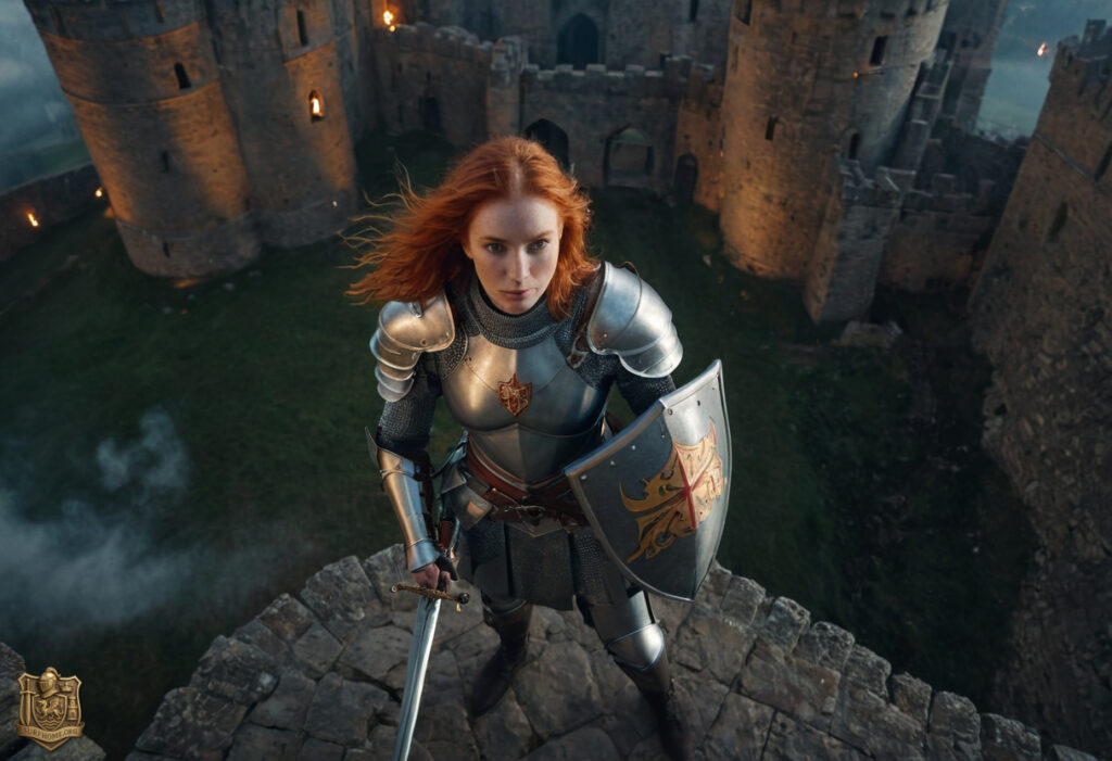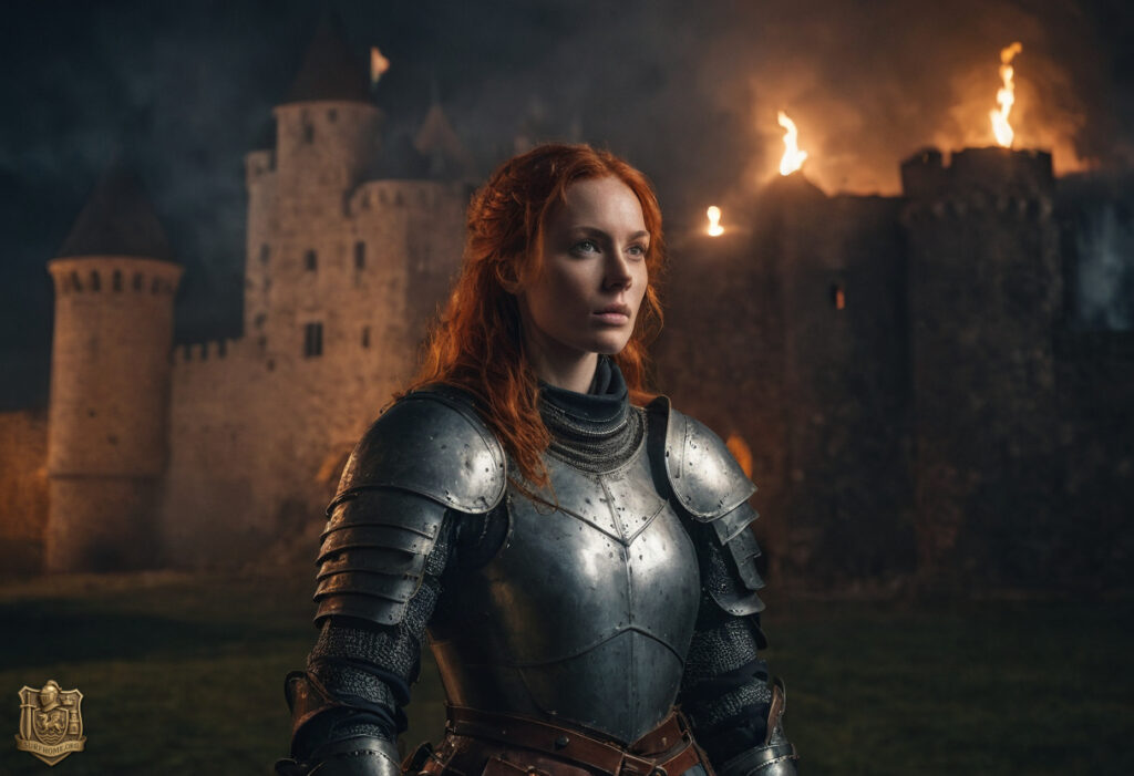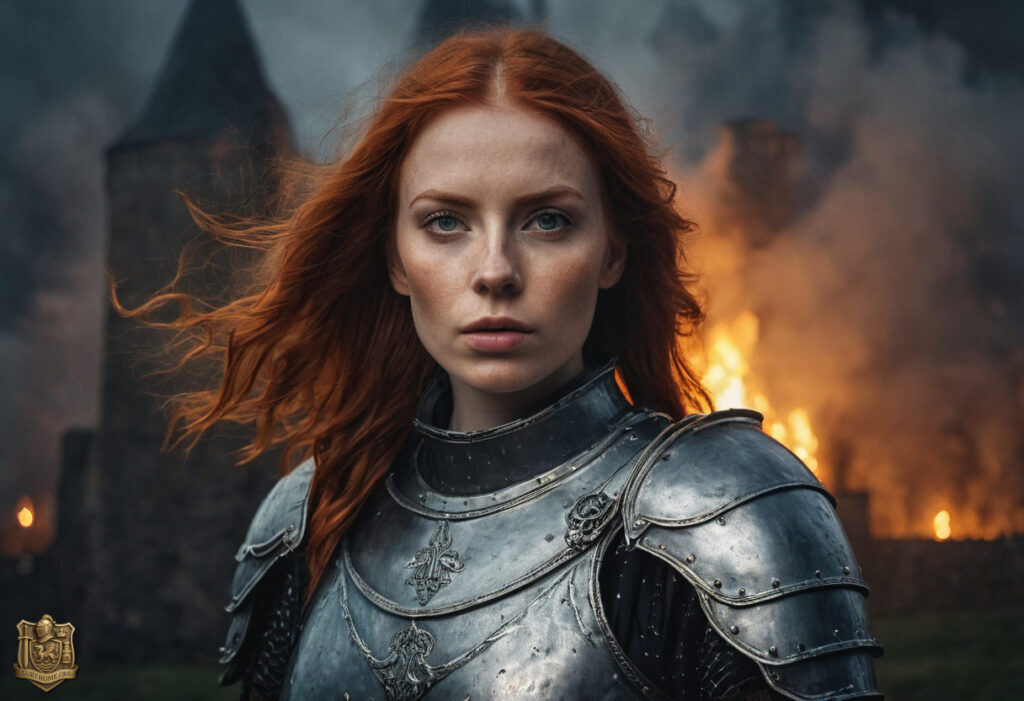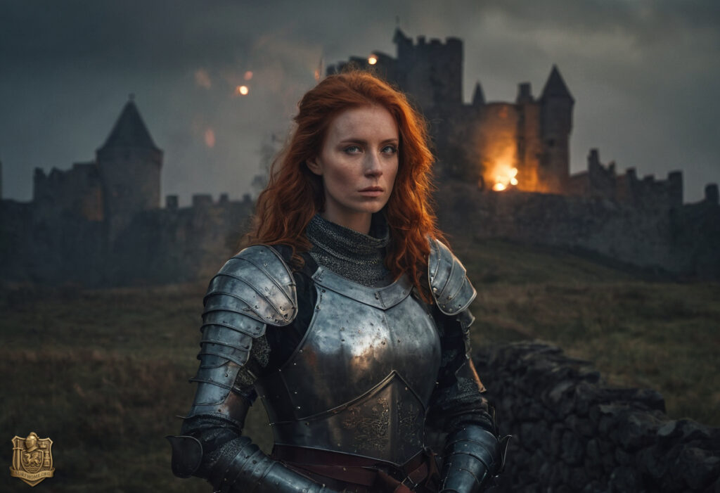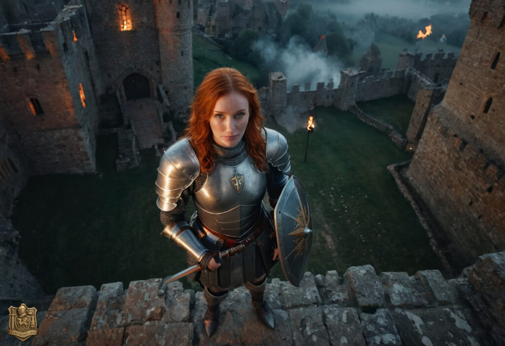 In dieser Bilderserie entfaltet sich eine mystische Szenerie: Eine junge, wunderschöne Frau mit feuerrotem Haar, gekleidet in glänzende Ritterrüstung, erhebt Schild und Schwert im Schein flackernder Fackeln. Im Hintergrund thront eine alte Burg, geheimnisvoll erleuchtet, umhüllt von sanftem Nebel.